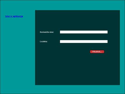 Unošenjem korisničkog imena i lozinke, pa zatim pritiskom na dugme PRIJAVA… pokreće se skripta b_Prijava koja čita fajl korisnici.txt, provjerava da li takav korisnik postoji, ako postoji upisuje u fajl datum i vrijeme zadnje prijave, te u zavisnosti od uloge korisnika otvara početni ekran sa navigacionim menijem sa lijeve strane. Navigacija kroz aplikaciju je intuitivna i realizovana je skriptom Navigacija. Slijedi kratak opis navigacije korisnika kroz aplikaciju.