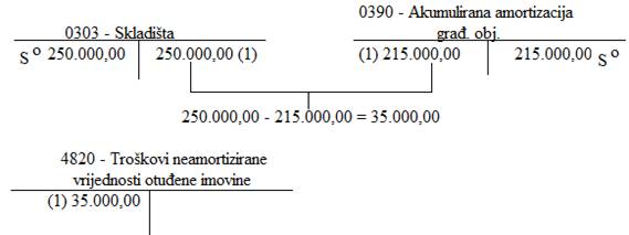 Predmet nekretnine, postrojenja i opreme treba isključiti iz bilance po njegovom otuđenju ili kad je sredstvo trajno povučeno iz upotrebe i kada se njegovim otuđenjem ne očekuju buduće ekonomske koristi (MRS 16, t. 55.). Primjer 6. Isknjižavanje potpuno amortiziranog sredstva