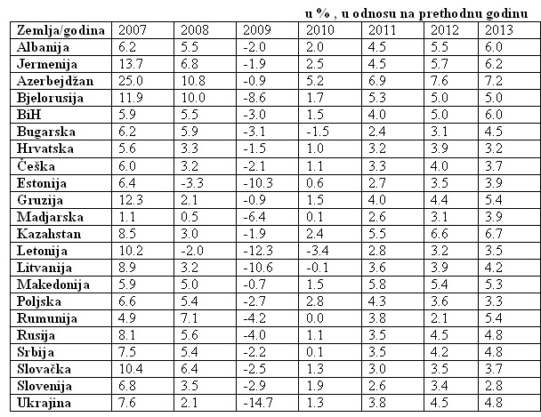 Procjene o kretanju privredne aktivnosti za veliku grupu zemalja u tranziciji i projekcije do 2013. godine napravljene od strane Statistical Agencies BMI Forecasts ukazuju da bi sve posmatrane tranzicione privrede u zonu solidnog privrednog rasta trebalo da uđu već 2010. godine (osim Letonije, Litvanije i Bugarske).